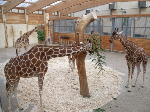 Wenn es für die Giraffen zu kalt oder glatt auf der Außenanlage ist, können sie im Giraffenhaus aus nächster Nöhe beobachtet werden. Die Besucherplattform befindet sich oberhalb der Lauffläche und so stehen die Besucher den großen Tieren Aug in Aug gegenüber - ein unvergessliches Erlebnis!