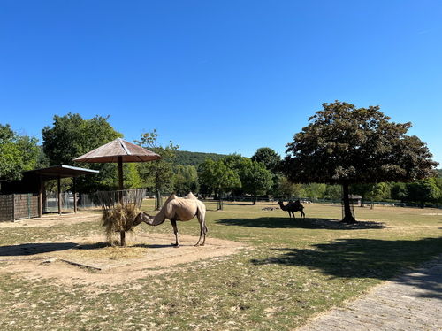 Oberhalb des Spielplatzes sind neben den Weiden der Shetlandponies die Anlagen für Dromedare und Trampeltiere, die oft neugierig über den Zaun schauen.